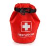 V7936 Apteczka Air Gifts w wodoodpornym pokrowcu z karabińczykiem, główna przegroda zamykana na klamrę zatrzaskową, wewnątrz: bandaż elastyczny 7,5 cm x 4,5 m, bandaż elastyczny 5 cm x 4,5 m, maseczka do resuscytacji, rękawice winylowe, płatki nasączone alkoholem 6 szt., chusteczki antyseptyczne 4 szt., okłady po użądleniu 4 szt., koc ratunkowy, chusta trójkątna, sterylne gaziki 2″x2″ 2 szt., sterylne gaziki 3″x3″ 2 szt., plastry 72x19mm 10 szt., plastry „H” 4 szt., guma uciskowa, nożyczki, pinceta, gwizdek, taśma klejąca i 4 agrafki.