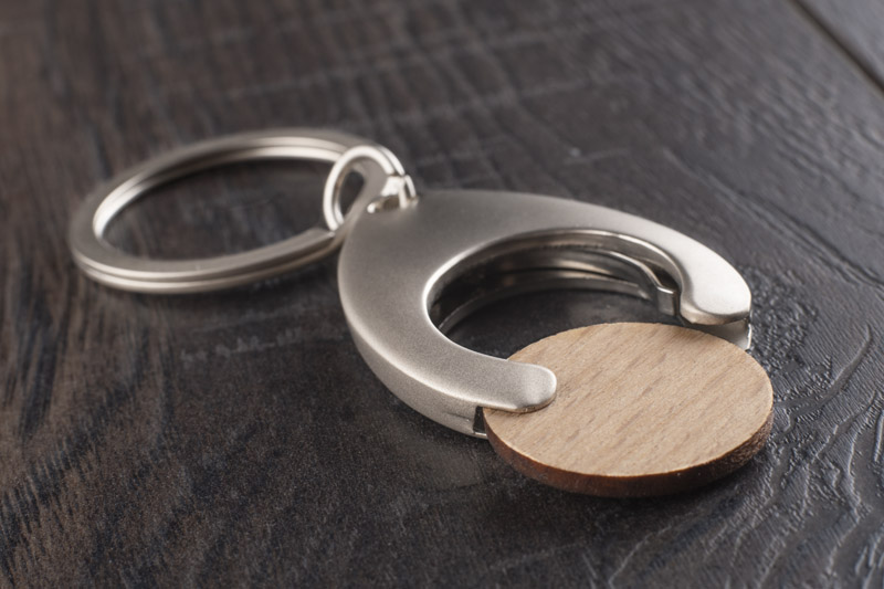 BC17872 Brelok metalowy wraz z żetonem wykonanym z drewna mebli po recyklingu. Żeton pasuje do wózków sklepowych. Zapakowany w brązową kopertę.