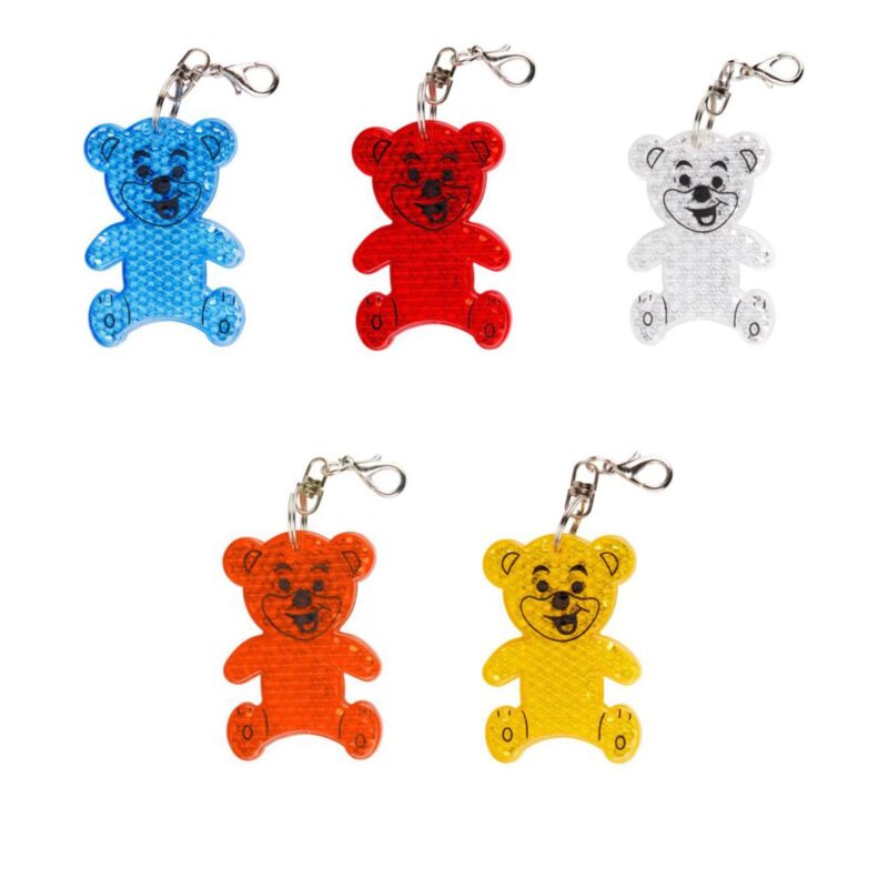R73235 Brelok w kształcie misia wykonany z twardego polistyrenu. Dwustronne światełko odblaskowe z karabińczykiem.