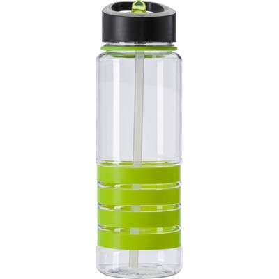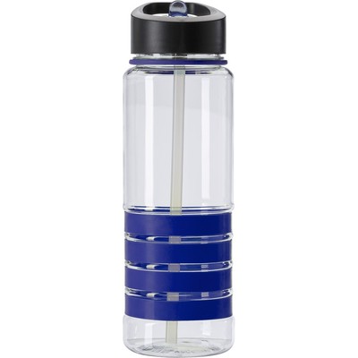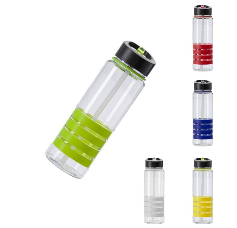V0662 Butelka sportowa 700 ml ze składanym dzióbkiem do picia i słomką, przezroczysta z 4 kolorowymi pierścieniami.