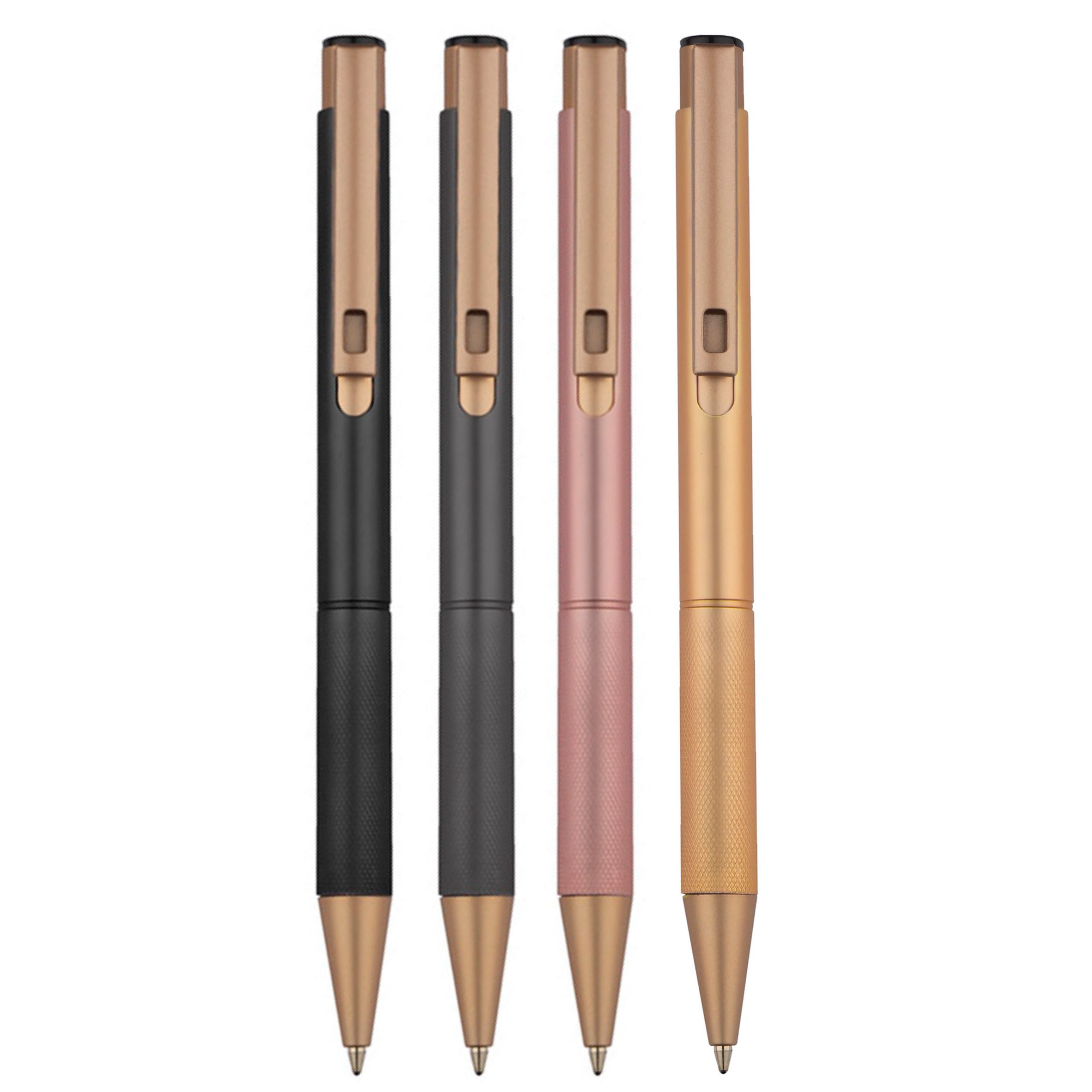 BC19689 Elegancki aluminiowy długopis. Wykończenia w kolorze złotym. Wkład półżelowy w kolorze niebieskim.