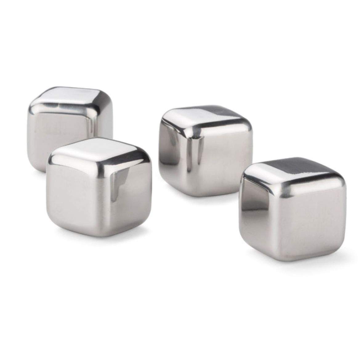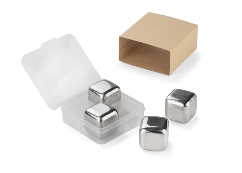 BC16535 Kostki chłodzące do napojów wykonane są ze stali nierdzewnej o podwyższonym standardzie i zapakowane w wygodne etui z tworzywa. Zestaw zawiera 4 kostki, które należy umieścić na minimum 4 godziny w zamrażarce, aby schłodziły się do pożądanej temperatury i wrzucić do szklanki z napojem. Doskonały gadżet zamiast tradycyjnych kostek lodu, gdyż nie rozcieńcza napoju.