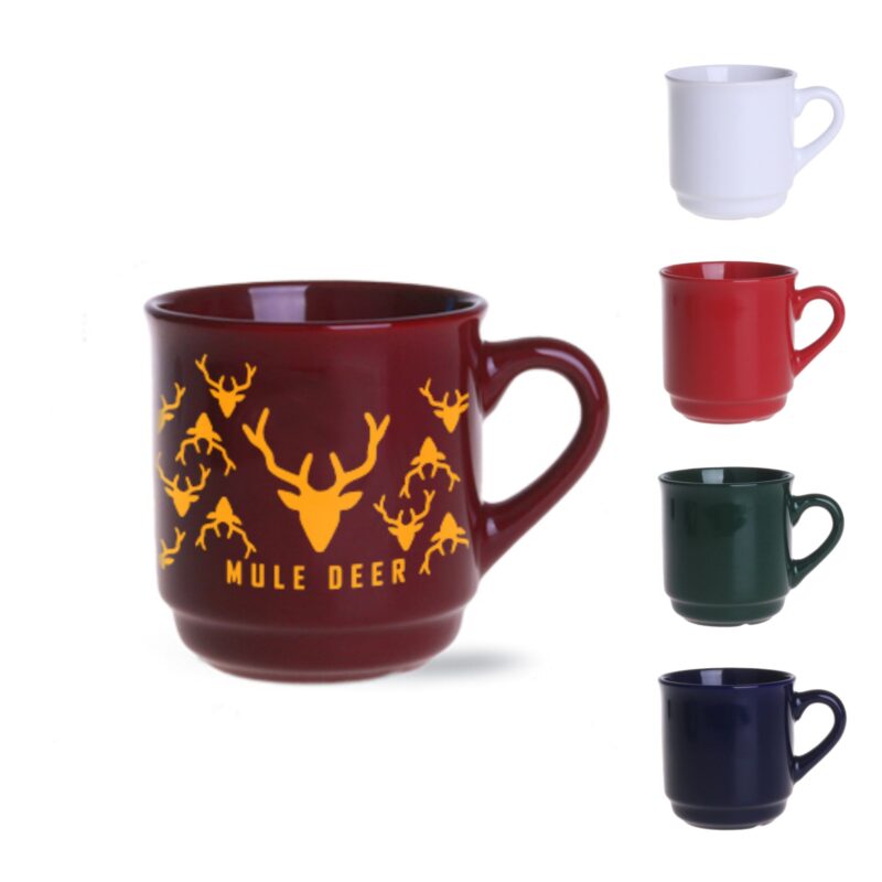 M_485 Kubek opracowany na potrzeby jarmarków świątecznych. Posiada klasyczny kształt uchwytu oraz prosty korpus, umożliwiający sztaplowanie. Kubek posiada znacznik cechy ukazującej pojemność 200ml oraz znak podmiotu odpowiedzialnego za wprowadzenie na rynek. Oznaczenia są zgodne z wymogami Unii Europejskiej.