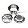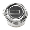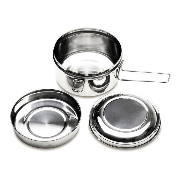 R08492.01 3-elementowy zestaw turystyczny ze stali nierdzewnej. W jego skład wchodzą: naczynie/garnek o pojemności 1l, mniejsze naczynie o pojemności 350 ml i pokrywka. Całość zamykana na klamry boczne. To idealny zestaw na biwak, kemping i plenerowe aktywności.