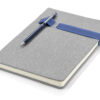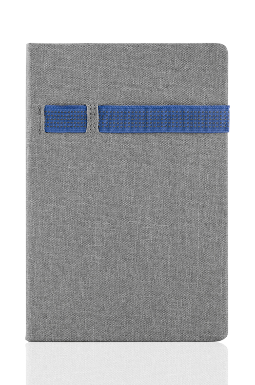 BC17691 Notes HOLDI posiada bardzo ciekawą okładkę w kolorze szarym lub niebieskim, wyglądem przypominającą lniany materiał. Zamykany jest za pomocą kolorowej gumki, która może służyć również jako miejsce na długopisy lub inne niezbędne przedmioty. Notes A5. 80 kartek w linie. Grubość papieru 80 gsm