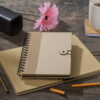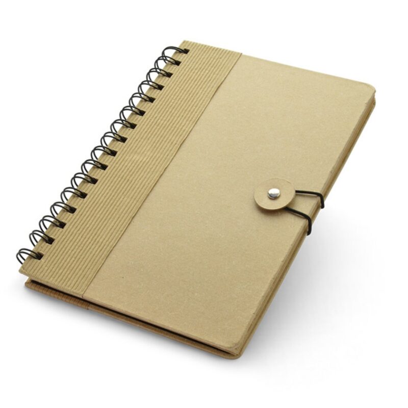 BC17605 Ekologiczny notes A5 na spirali z praktycznym zamknięciem na gumkę. Zawiera 80 kartek w linie wykonanych z papieru po recyklingu. Uroku dodaje ozdobne wykończenie tekturą falistą. Logo nadrukujemy na okładce.