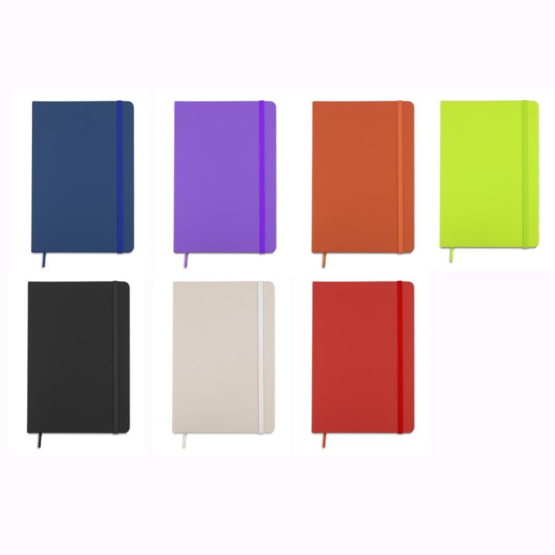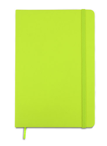 BC17529 Gustowny notes A6 z kolorową gumką wykonany z ekoskóry PU. Notes zawiera 80 kartek ecru w linie koloru pomarańczowego. Logo nadrukujemy na okładce.