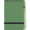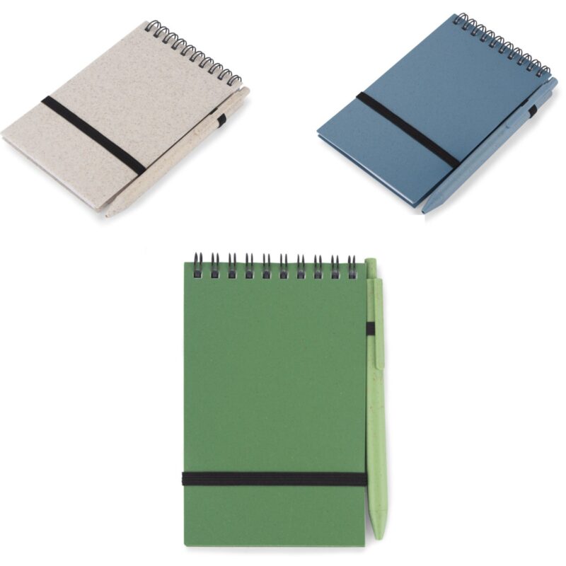 BC18001 Notes TRESA z długopisem, kolorystyką dopasowanym do okładki. Długopis oraz okładka notesu wykonane są ze słomy pszenicznej. Notes na spirali, posiada 70 kartek w kratkę wykonanych z recyklingowanego papieru. Zamykany za pomocą gumki. Format A6. Wkład w długopisie w kolorze niebieskim.