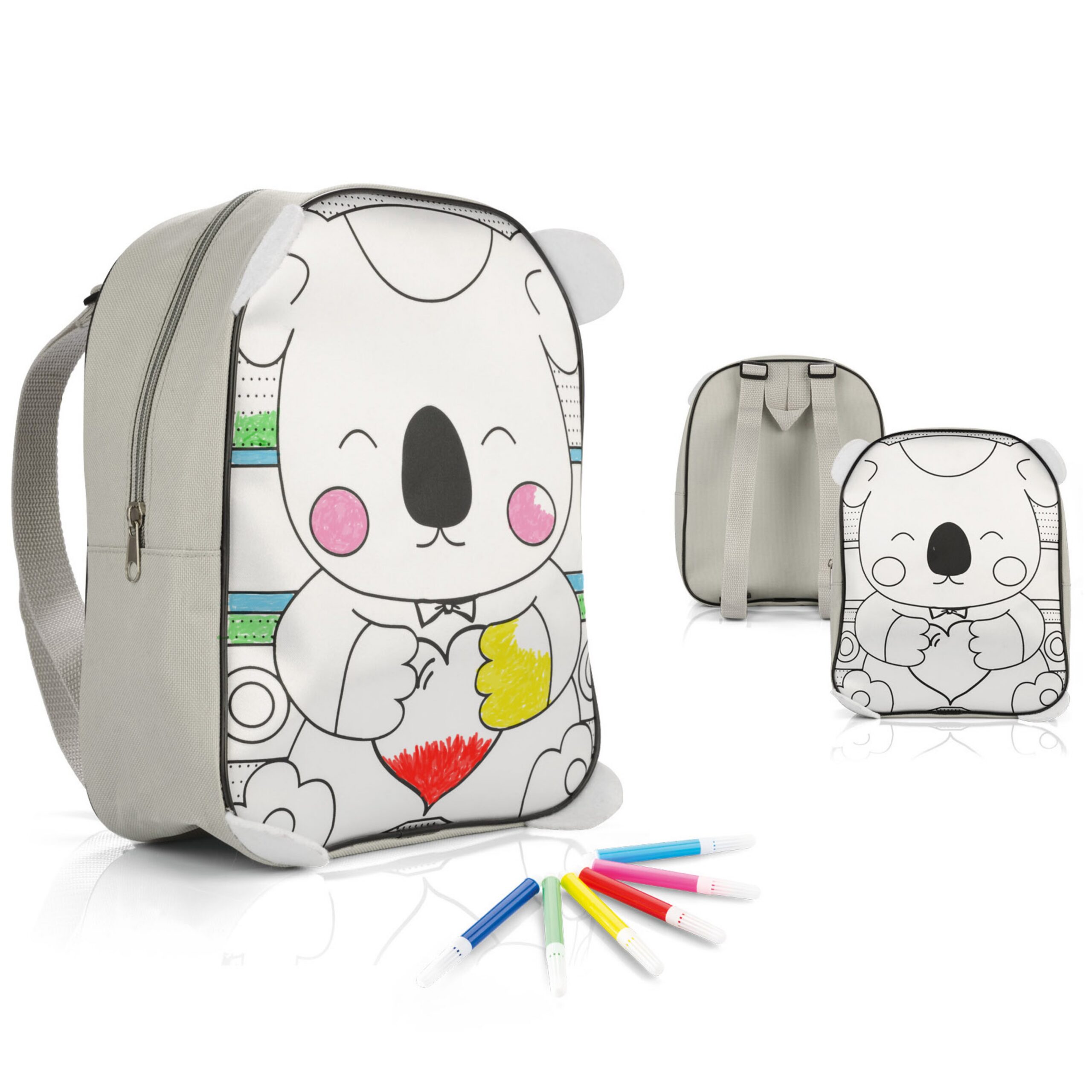BC20287 Nieduży plecak z nadrukiem sympatycznego misia do samodzielnego pokolorowania. W zestawie pisaki w 6 kolorach. Plecak TEDDY pomieści niezbędne przedmioty potrzebne małym turystom na pierwsze wyprawy.