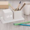BC03083 Organizer na biurko wykonany z płyty MDF o modnym wykończeniu w kolorze jasnego drewna, który świetnie pasuje do nowoczesnych pomieszczeń. Posiada pojemnik na długopisy oraz zegar z funkcjami: kalendarza, alarmu oraz termometru.