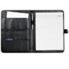 R91707 Wykonana z ekoskóry, czarna teczka wyposażona w kieszonkę na wizytówki – mieści 20 wizytówek, przegródkę na dokumenty oraz wkład papierowy A4(20 kartek). Kartka w linię. Długopis nie jest dołączony.