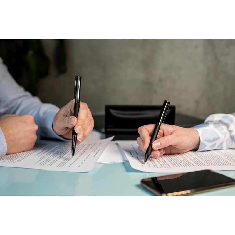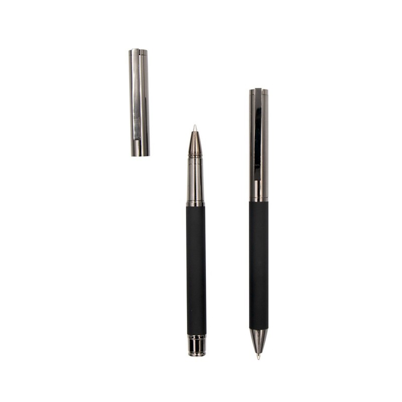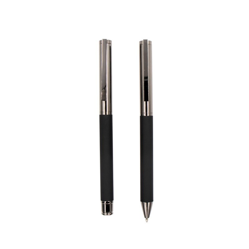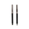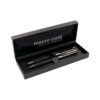 V9346 Zestaw piśmienny Mauro Conti, długopis i pióro kulkowe z czarnym trzonem i błyszczącymi elementami, w ozdobnym pudełku.