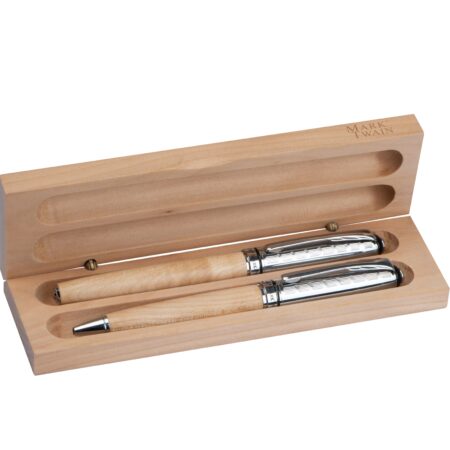 M1253213 Elegancki zestaw do pisania zamknięty w pudełku z naturalnego, idealnie wypolerowanego drewna. W środku znajdziesz długopis oraz pióro kulkowe, oba z wkładami piszącymi na niebiesko. Długopis Mark Twain z logo posiada przekręcany mechanizm wysuwania wkładu piszącego, natomiast pióro kulkowe jest otwierane za pomocą metalowej zatyczki. Oba akcesoria piśmiennicze posiadają korpus wykonany z naturalnego, surowego drewna. Dzięki temu, że zostało ono idealnie wypolerowane, długopis oraz pióro są bardzo przyjemne w użytkowaniu. Oba te akcesoria piśmiennicze Mark Twain z logo są nieco cięższe od standardowych, plastikowych długopisów, przez co dają niepowtarzalne wrażenie luksusu, podczas codziennego sporządzania notatek czy podpisywania dokumentów. Drewniane pudełko, w którym umieszczono zestaw do pisania Mark Twain, otwiera się łatwo i płynnie, dzięki wbudowanym zawiasom. Pudełko nie posiada zamknięcia, natomiast prezentuje się niezwykle elegancko na biurku, utrzymując zestaw do pisania z logo w nienagannym porządku.