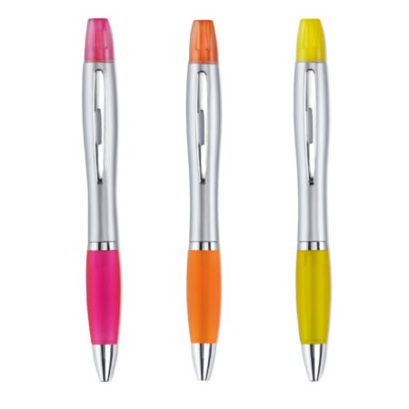 MO7440 2 w 1. Plastikowy długopis i zakreślacz. Srebrne satynowe wykończenie i chromowane wstawki. Niebieski wkład.