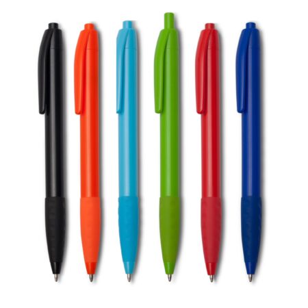 R04445 Plastikowy długopis promocyjny z gumowym uchwytem. Wkład w kolorze niebieskim.