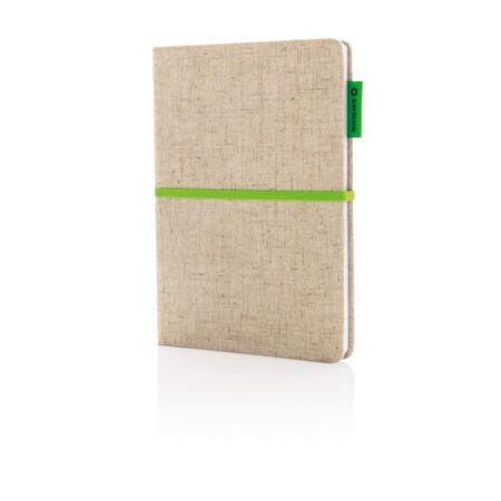 P773.943 Ekologiczny notatnik A5 (80 kartek w linie z papieru z bambusa), okładka z juty, tasiemka zakładkowa i elastyczna opaska do zamykania.