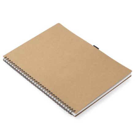 BC17875 Klasyczny notes na spirali w papierowej, brązowej okładce wraz z miejscem na długopis. Kartki w notesie wykonane są z papieru kamiennego. Papier ten jest wyjątkowo wytrzymały i odporny na wilgoć. Posiada 60 kartek w linie, format A4.