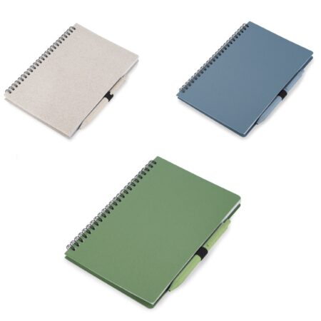 BC18000 Notes TRESA z długopisem, kolorystyką dopasowanym do okładki. Długopis oraz okładka notesu wykonane są ze słomy pszenicznej. Notes na spirali, posiada 70 kartek w kratkę wykonanych z recyklingowanego papieru. Format A5. Wkład w długopisie w kolorze niebieskim.
