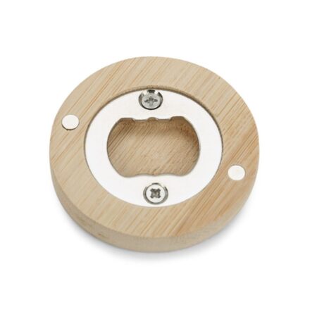 BC17713 Praktyczny otwieracz do kapsli wykonany z ekologicznego materiału – bambusa. Umieszczone na spodzie magnesy umożliwiają przymocowanie go do metalowych części, np. drzwi lodówki, dzięki czemu otwieracz jest łatwo dostępny zawsze, kiedy go potrzebujemy. Cześć służąca do otwierania butelek wykonana z wytrzymałej stali nierdzewnej.