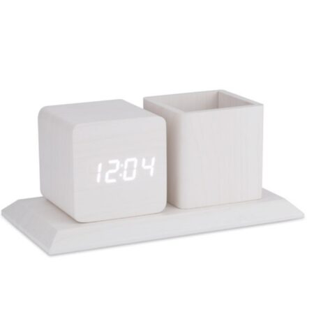 BC03083 Organizer na biurko wykonany z płyty MDF o modnym wykończeniu w kolorze jasnego drewna, który świetnie pasuje do nowoczesnych pomieszczeń. Posiada pojemnik na długopisy oraz zegar z funkcjami: kalendarza, alarmu oraz termometru.